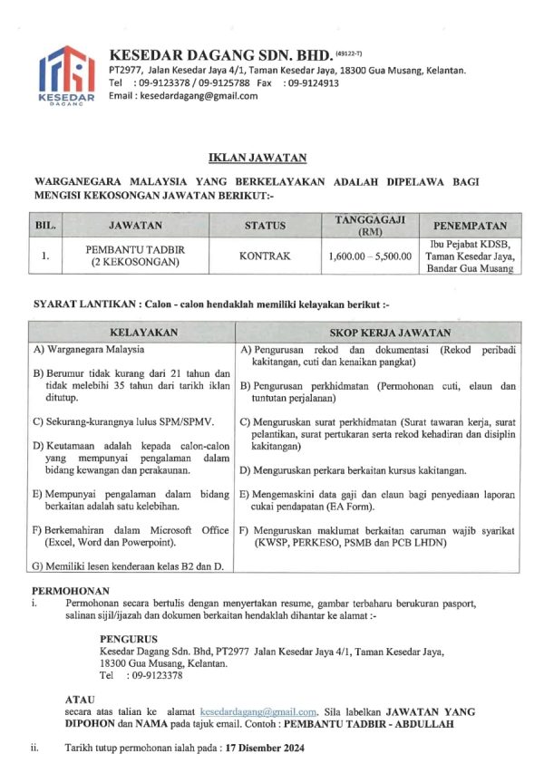Iklan Kini Kesedar Dagang Sdn. Bhd. Like serta Ikut Facebook Kami, follow Chanel WhatsApp Jawatan Kosong & Telegram Portal SPA9 untuk capaian pantas kekosongan jawatan daripada kami sekarang. Klik Iklan Jawatan
