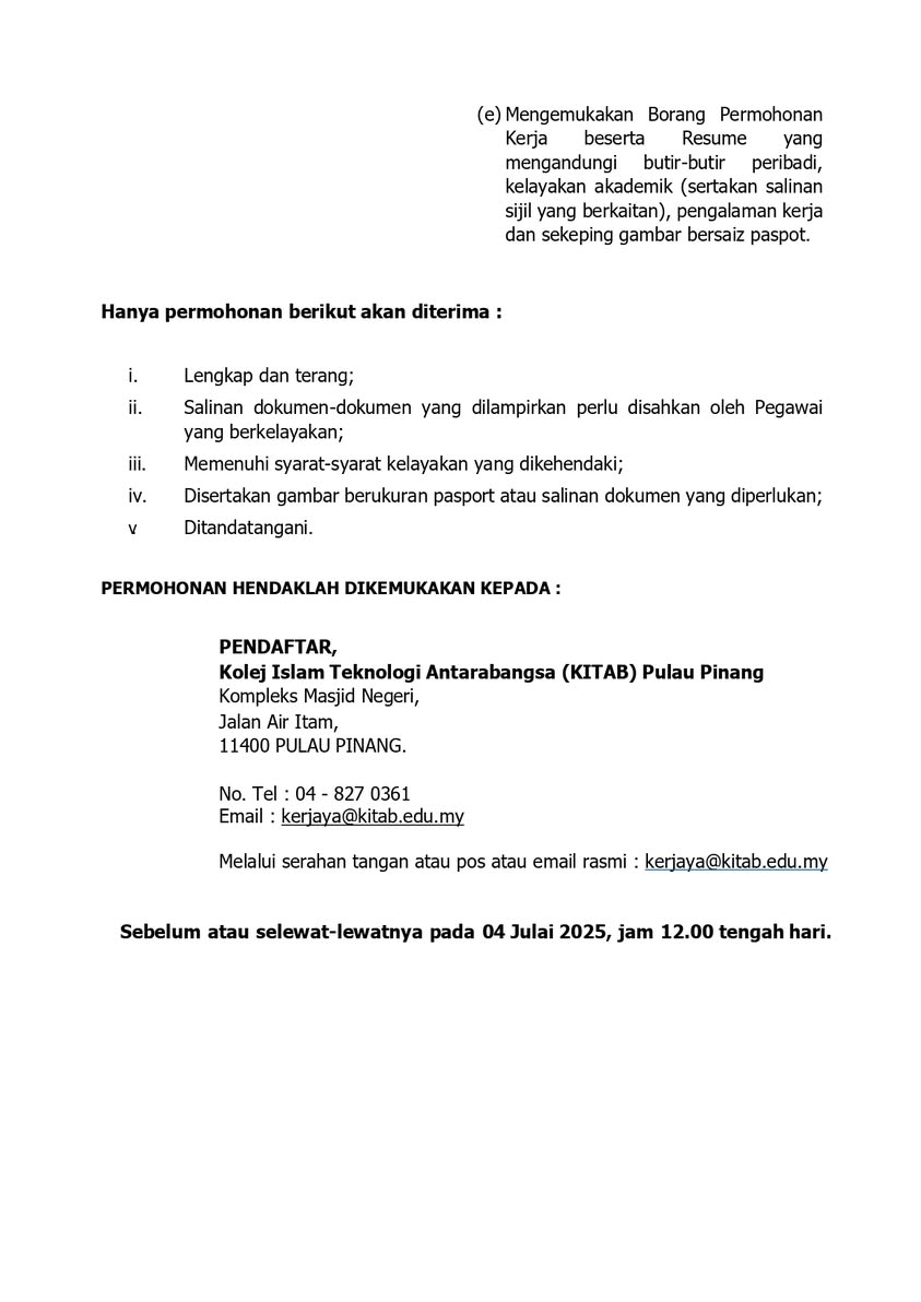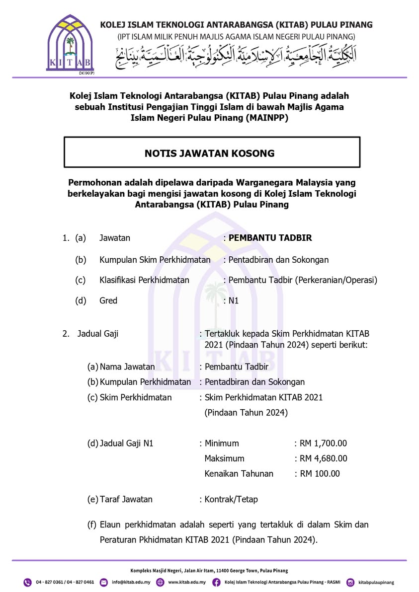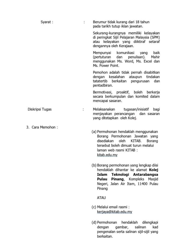 Iklan Kini Kolej Islam Teknologi Antarabangsa Pulau Pinang Klik Jawatan Disini Like serta Ikut Facebook Kami, follow Chanel WhatsApp Jawatan Kosong & Telegram Portal SPA9 untuk capaian pantas kekosongan jawatan daripada kami sekarang.