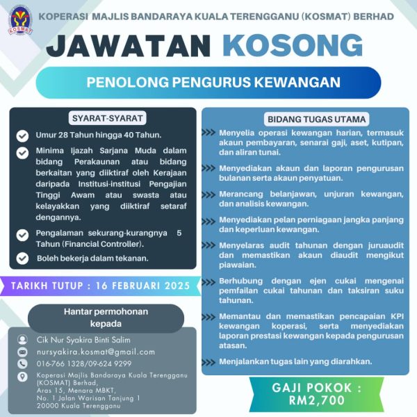 Iklan Kini Koperasi Majlis Bandaraya Kuala Terengganu (KOSMAT) Berhad Like serta Ikut Facebook Kami, follow Chanel WhatsApp Jawatan Kosong & Telegram Portal SPA9 untuk capaian pantas kekosongan jawatan daripada kami sekarang. Klik Iklan Jawatan