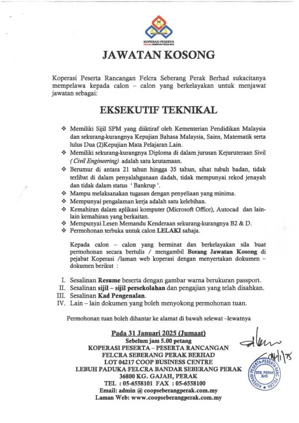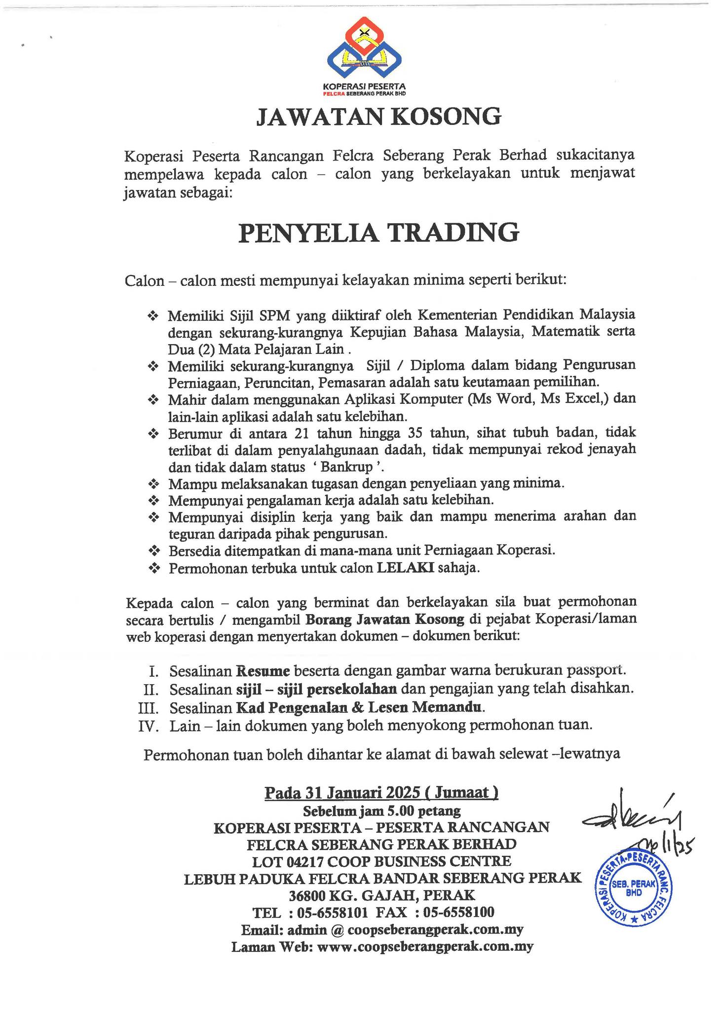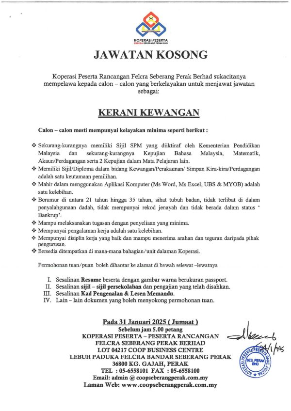 Iklan Kini Koperasi Peserta Rancangan Felcra Seberang Perak Like serta Ikut Facebook Kami, follow Chanel WhatsApp Jawatan Kosong & Telegram Portal SPA9 untuk capaian pantas kekosongan jawatan daripada kami sekarang.