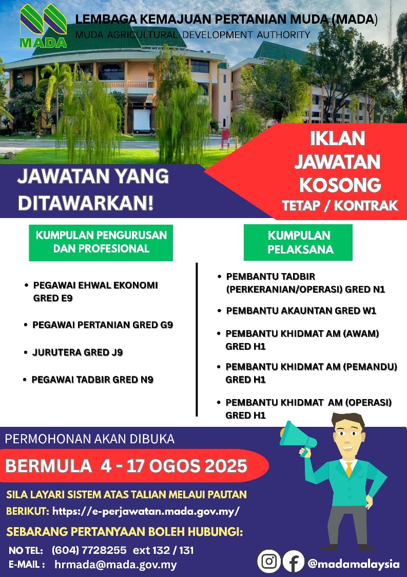 Iklan Kini Lembaga Kemajuan Pertanian Muda (MADA) Klik Jawatan Disini Like serta Ikut Facebook Kami, follow Chanel WhatsApp Jawatan Kosong & Telegram Portal SPA9 untuk capaian pantas kekosongan jawatan daripada kami sekarang.