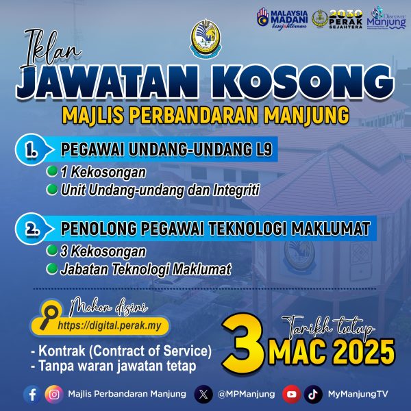 Iklan Kini Majlis Perbandaran Manjung Like serta Ikut Facebook Kami, follow Chanel WhatsApp Jawatan Kosong & Telegram Portal SPA9 untuk capaian pantas kekosongan jawatan daripada kami sekarang. Klik Jawatan Disini
