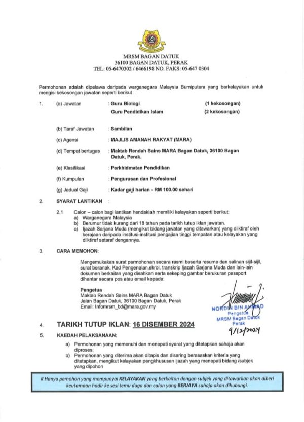 Iklan Kini Maktab Rendah Sains Mara (MRSM) Bagan Datuk Like serta Ikut Facebook Kami, follow Chanel WhatsApp Jawatan Kosong & Telegram Portal SPA9 untuk capaian pantas kekosongan jawatan daripada kami sekarang.