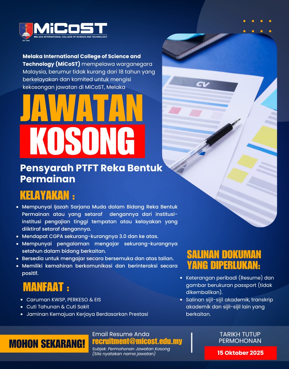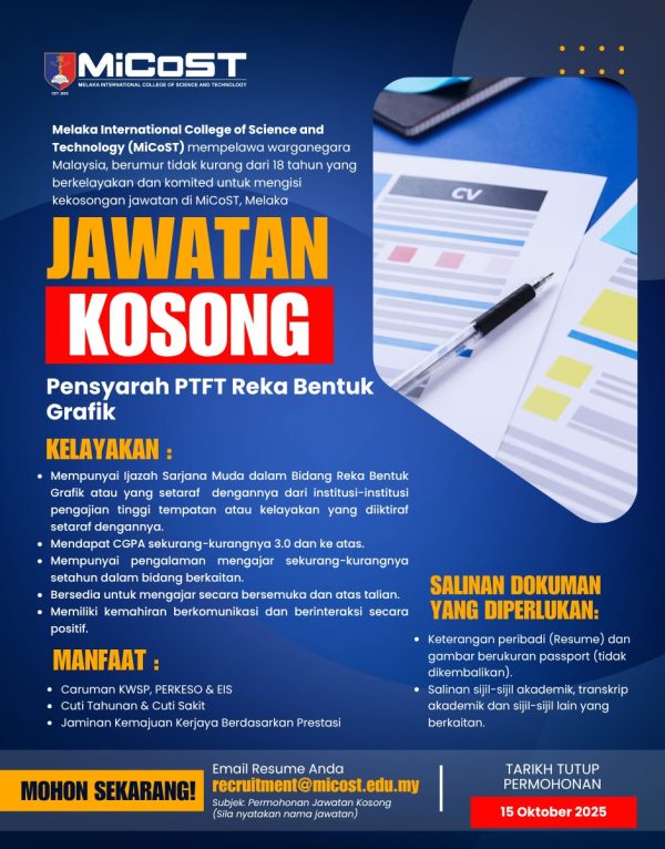 Iklan Kini Melaka International College of Science and Technology (MiCoST) Klik Iklan Jawatan Like serta Ikut Facebook Kami, follow Chanel WhatsApp Jawatan Kosong & Telegram Portal SPA9 untuk capaian pantas kekosongan jawatan daripada kami sekarang.