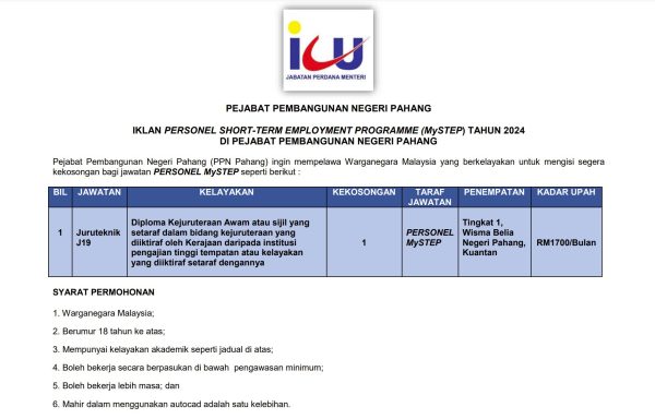 Jawatan kosong yang terdapat dalam iklan di Pejabat Pembangunan Negeri Pahang (PPN Pahang) untuk PERSONEL MySTEP: