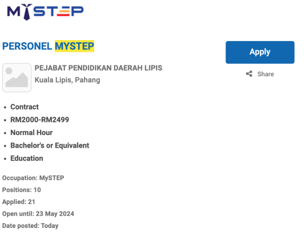 Permohonan jawatan ini boleh dibuat melalui Portal MyFutureJobs. Sila ke Portal MyFutureJobs dan Masukkan Kata Carian yang ingin dicari “PEJABAT PENDIDIKAN DAERAH LIPIS” di bahagian carian untuk memohon jawatan yang diiklankan.