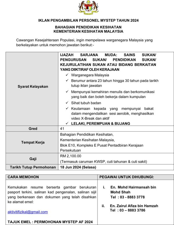 | Personal MySTEP | Pendidikan Kesihatan, KKM | E-mel permohonan ke [email protected] | Sains Sukan / Pengurusan Sukan / Pendidikan Sukan / Kejurulatihan Sukan atau bidang berkaitan yang diiktiraf oleh kerajaan |