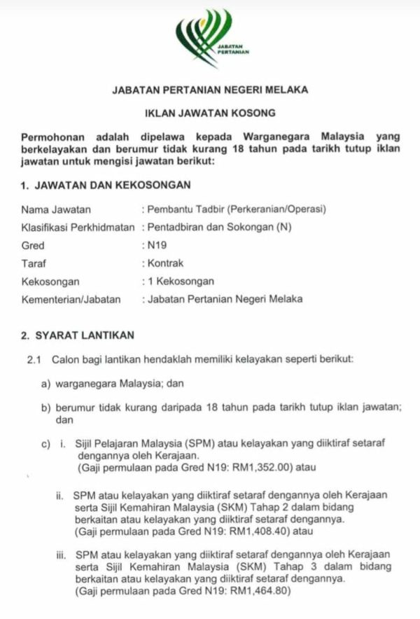 Iklan Kini Peluang Kerjaya di Jabatan Pertanian Negeri Melaka