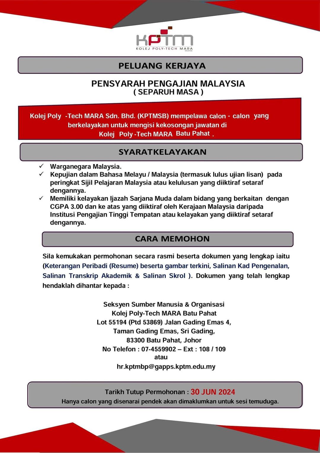 Jangan lepaskan peluang ini untuk menyertai pasukan KPTM Batu Pahat dan membina kerjaya yang cemerlang! 🌟