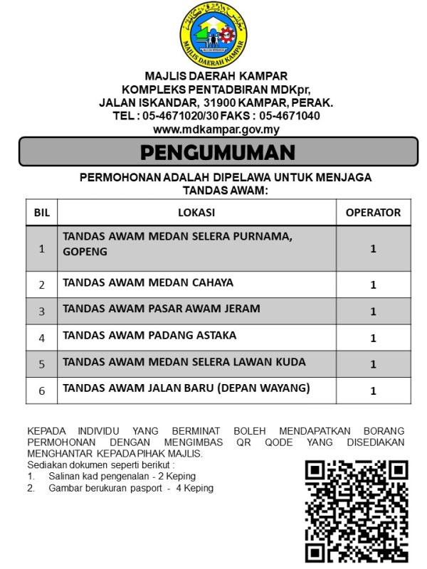 Jangan lepaskan peluang ini untuk menjadi sebahagian daripada Majlis Daerah Kampar sebagai operator tandas awam. Kami menanti permohonan anda!
