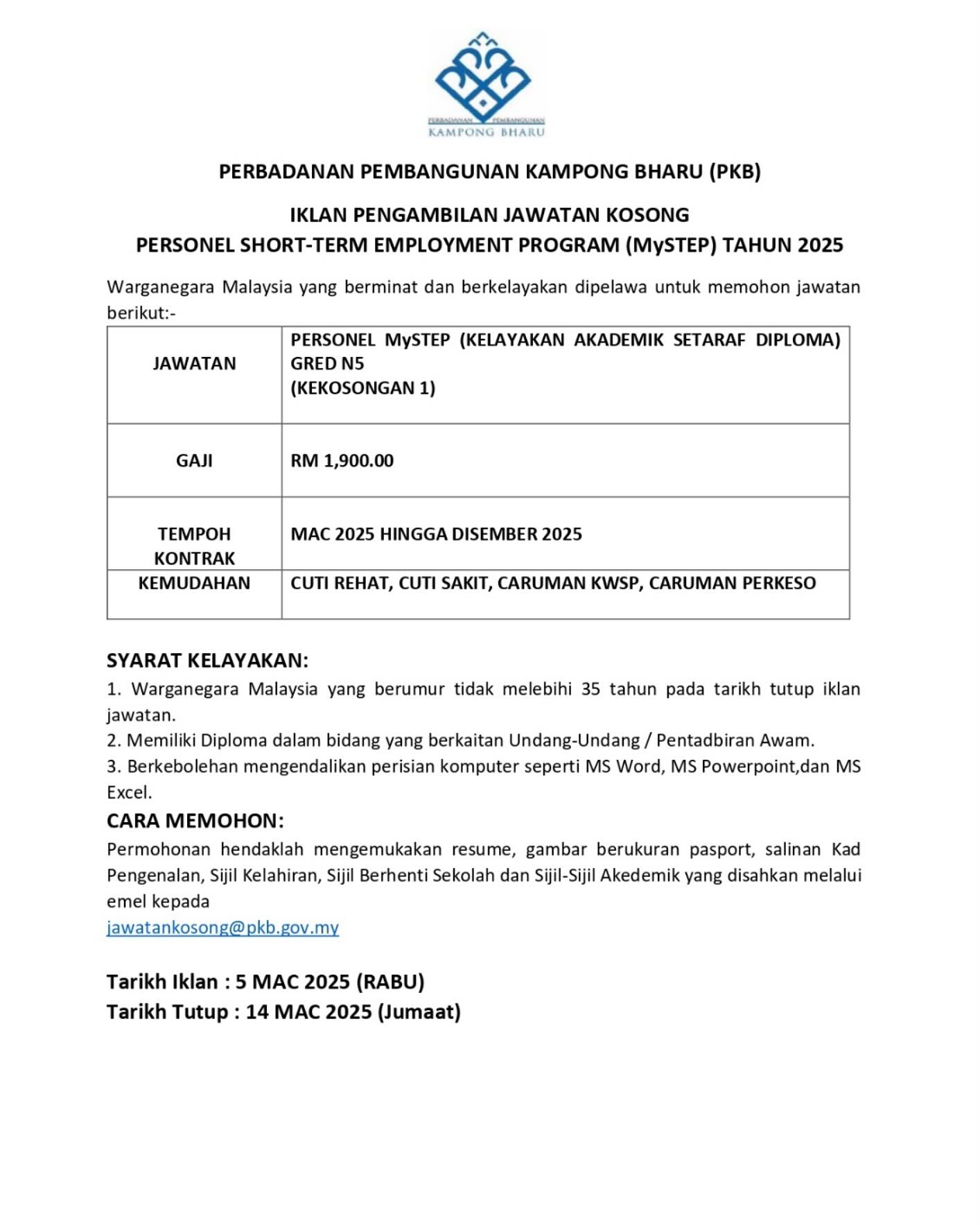Iklan Kini Perbadanan Pembangunan Kampong Bharu – PKB Klik Jawatan Disini Like serta Ikut Facebook Kami, follow Chanel WhatsApp Jawatan Kosong & Telegram Portal SPA9 untuk capaian pantas kekosongan jawatan daripada kami sekarang.