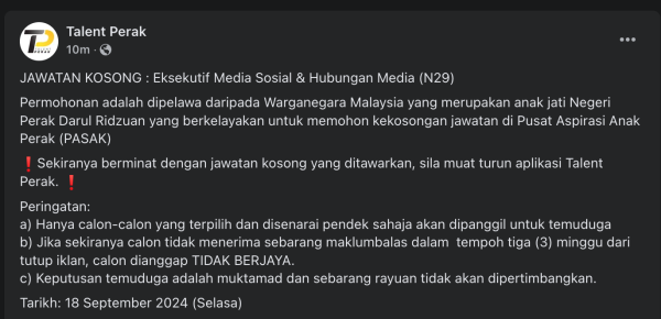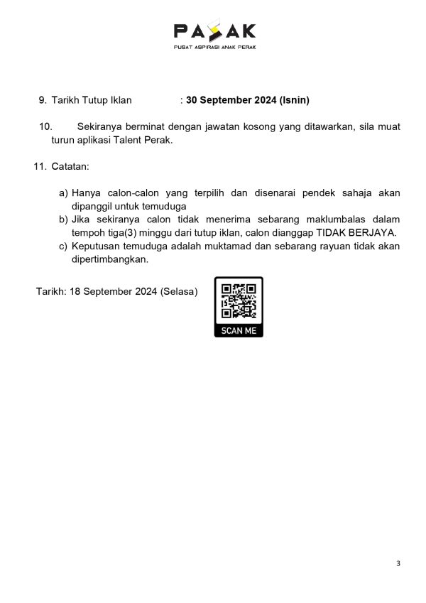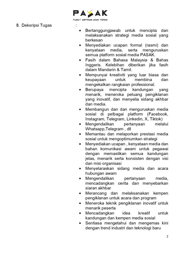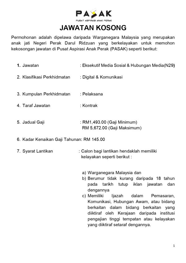 Iklan Kini Pusat Aspirasi Anak Perak (PASAK) Like serta Ikut Facebook Kami, follow Chanel WhatsApp Jawatan Kosong & Telegram Portal SPA9 untuk capaian pantas kekosongan jawatan daripada kami sekarang.