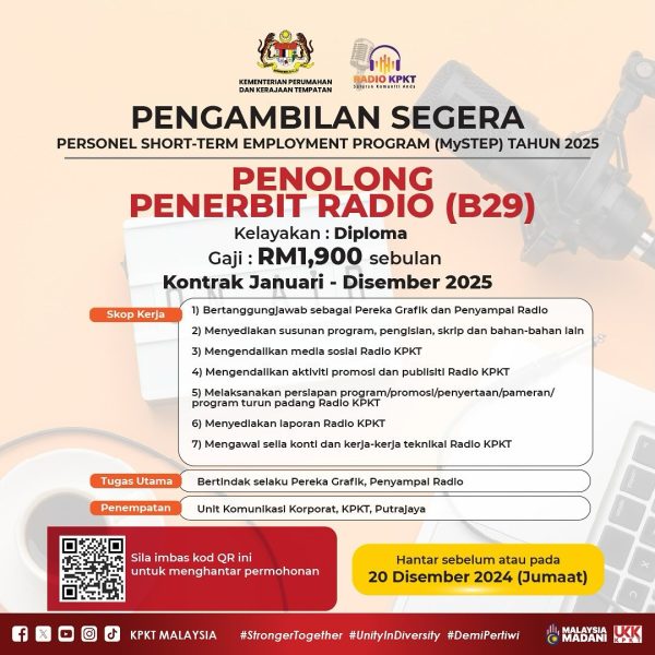 IKlan Kini Radio KPKT Like serta Ikut Facebook Kami, follow Chanel WhatsApp Jawatan Kosong & Telegram Portal SPA9 untuk capaian pantas kekosongan jawatan daripada kami sekarang. Klik Iklan Jawatan