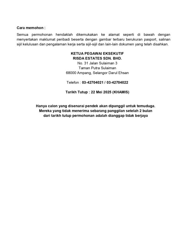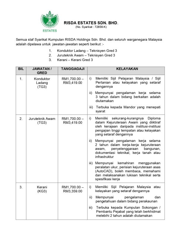 Iklan Kini RISDA Holdings Sdn. Bhd Klik Jawatan Disini Like serta Ikut Facebook Kami, follow Chanel WhatsApp Jawatan Kosong & Telegram Portal SPA9 untuk capaian pantas kekosongan jawatan daripada kami sekarang.