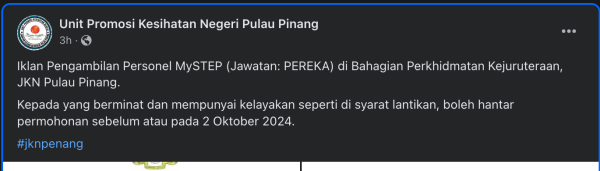 Iklan Kini Unit Promosi Kesihatan Negeri Pulau Pinang ‘ Like serta Ikut Facebook Kami, follow Chanel WhatsApp Jawatan Kosong & Telegram Portal SPA9 untuk capaian pantas kekosongan jawatan daripada kami sekarang.