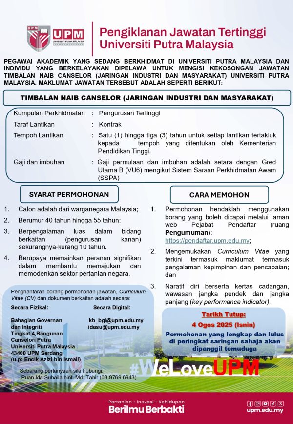 Iklan Kini Universiti Putra Malaysia Klik Jawatan Disini Like serta Ikut Facebook Kami, follow Chanel WhatsApp Jawatan Kosong & Telegram Portal SPA9 untuk capaian pantas kekosongan jawatan daripada kami sekarang.