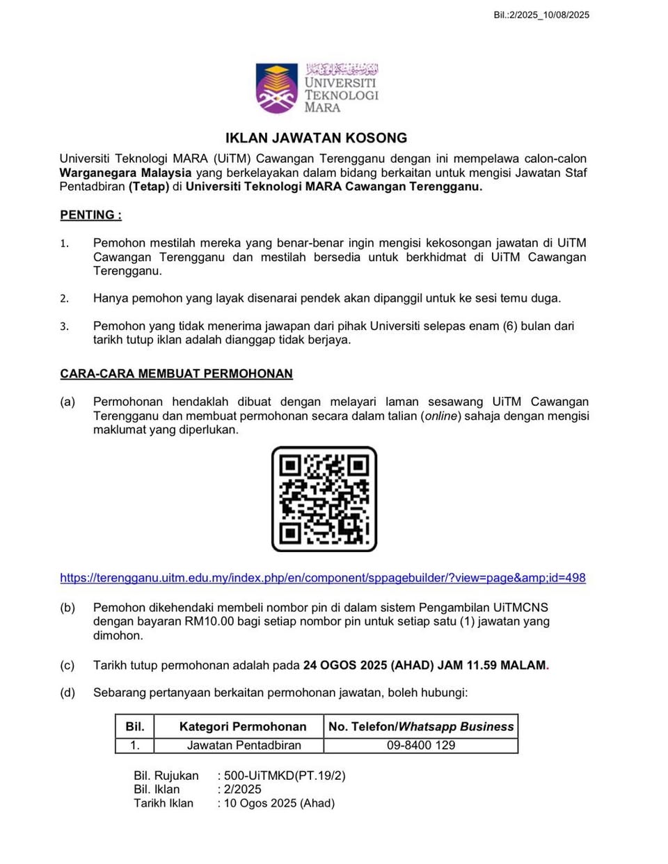 Iklan Kini Universiti Teknologi MARA (UiTM) Cawangan Terengganu Klik Iklan Disini Like serta Ikut Facebook Kami, follow Chanel WhatsApp Jawatan Kosong & Telegram Portal SPA9 untuk capaian pantas kekosongan jawatan daripada kami sekarang.