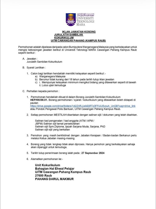 Iklan Kini Universiti Teknologi Mara (UiTM) Pahang Like serta Ikut Facebook Kami, follow Chanel WhatsApp Jawatan Kosong & Telegram Portal SPA9 untuk capaian pantas kekosongan jawatan daripada kami sekarang.