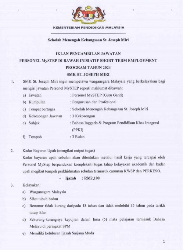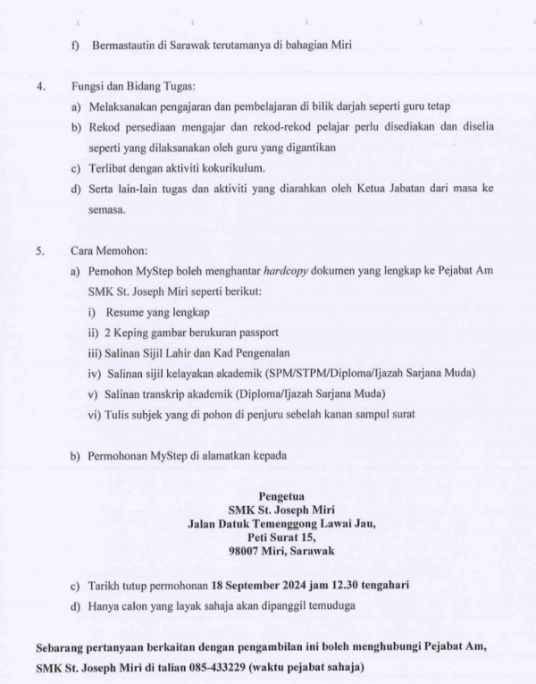 Iklan KiniJawatan Kosong Personel MySTEP Sekolah Menengah St. Joseph Miri Like serta Ikut Facebook Kami, follow Chanel WhatsApp Jawatan Kosong & Telegram Portal SPA9 untuk capaian pantas kekosongan jawatan daripada kami sekarang.