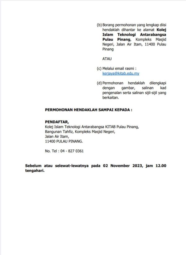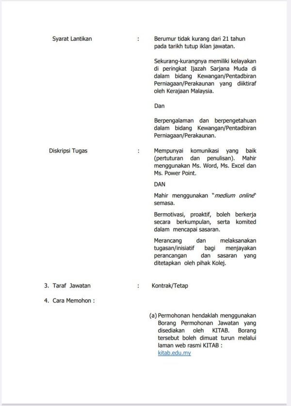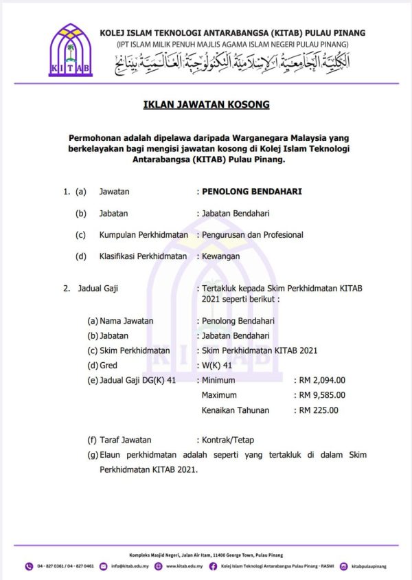 Iklan Kosong Kolej Islam Teknologi Antarabangsa (KITAB) Like serta Ikut Facebook Kami, follow Chanel WhatsApp Jawatan Kosong & Telegram Portal SPA9 untuk capaian pantas kekosongan jawatan daripada kami sekarang.