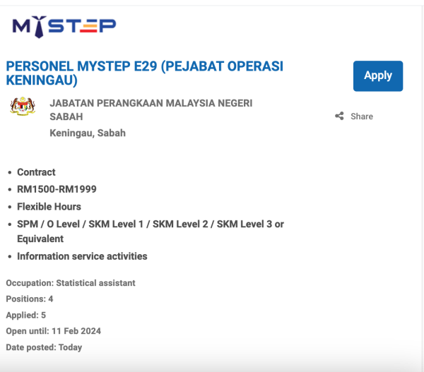 Iklan Mystep Jawatan Kosong Jabatan Perangkaan Negeri Sabah