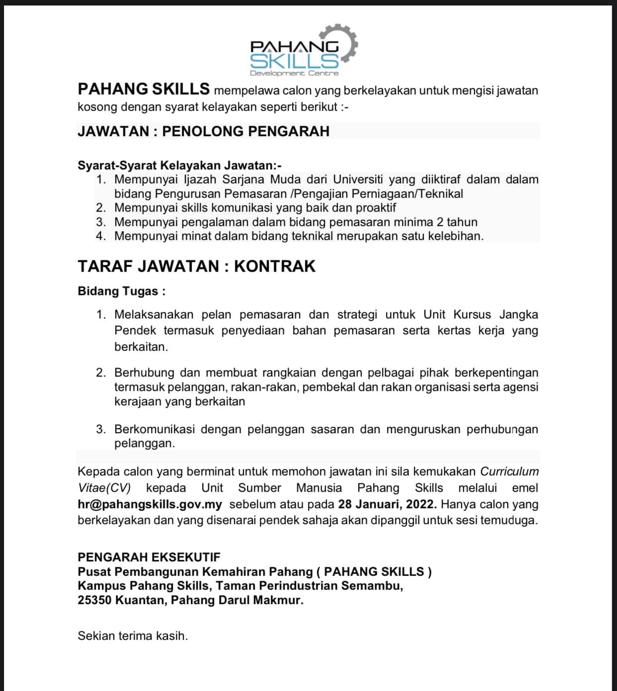 Iklan Jawatan Pusat Pembangunan Kemahiran Pahang (Pahang Skills) Like serta Ikut Facebook Kami, follow Chanel WhatsApp Jawatan Kosong & Telegram Portal SPA9 untuk capaian pantas kekosongan jawatan daripada kami sekarang.