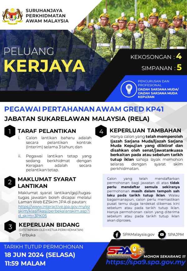 Jabatan Sukarelawan Malaysia (RELA) kini membuka peluang pekerjaan kepada individu yang berminat dan berkelayakan. Terdapat empat kekosongan untuk jawatan Pegawai Pertahanan Awam Gred KP41.