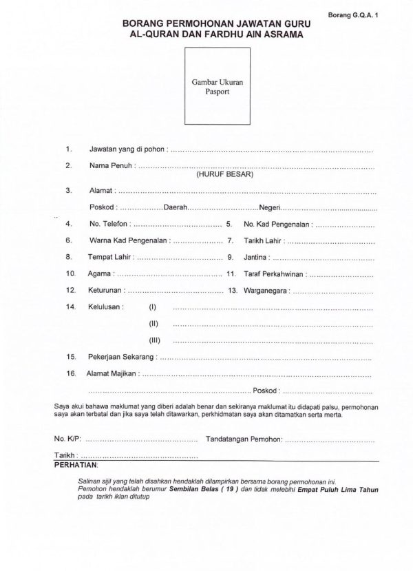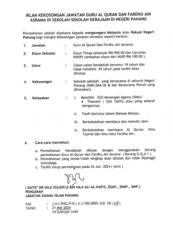 Iklan Peluang Mengajar Al-Quran dan Fardhu Ain di Sekolah-Sekolah Kerajaan Negeri Pahang