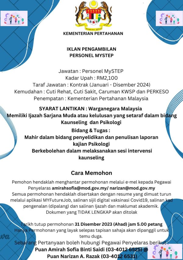 Iklan Pengambilan Jawatan Kosong Kementerian Pertahanan Malaysia (MINDEF) Like serta Ikut Facebook Kami, follow Chanel WhatsApp Jawatan Kosong & Telegram Portal SPA9 untuk capaian pantas kekosongan jawatan daripada kami sekarang.