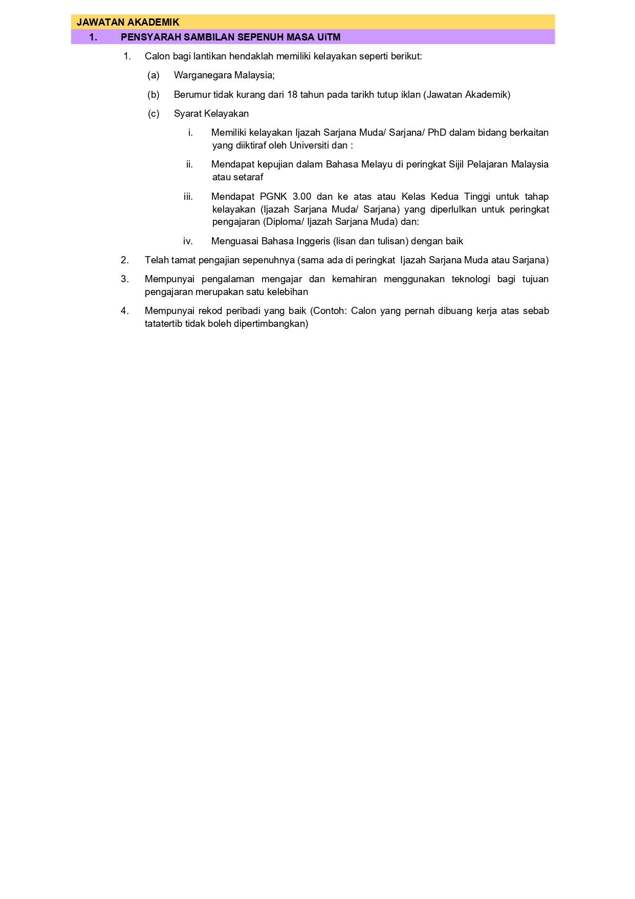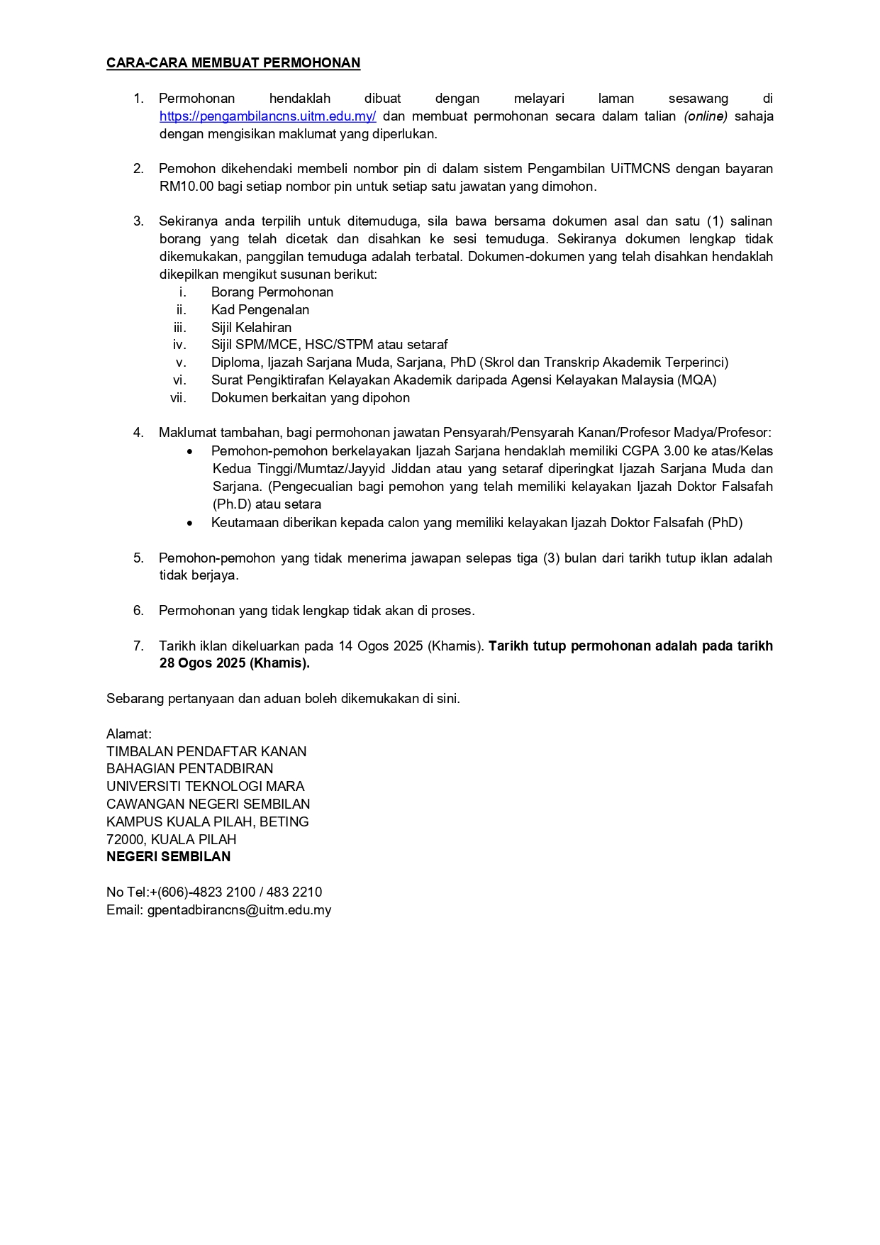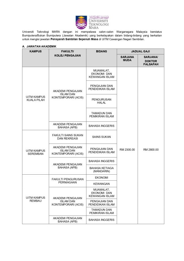 Iklan Pengambilan Pensyarah Sambilan Sepenuh Masa Di Uitm Cawangan Negeri Sembilan Klik Iklan Disini Like serta Ikut Facebook Kami, follow Chanel WhatsApp Jawatan Kosong & Telegram Portal SPA9 untuk capaian pantas kekosongan jawatan daripada kami sekarang.