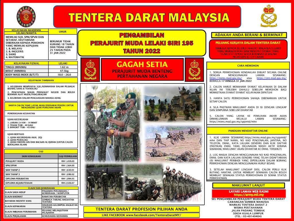 Iklan Jawatan Tentera Darat Malaysia Like serta Ikut Facebook Kami, follow Chanel WhatsApp Jawatan Kosong & Telegram Portal SPA9 untuk capaian pantas kekosongan jawatan daripada kami sekarang. LINK PERMOHONAN