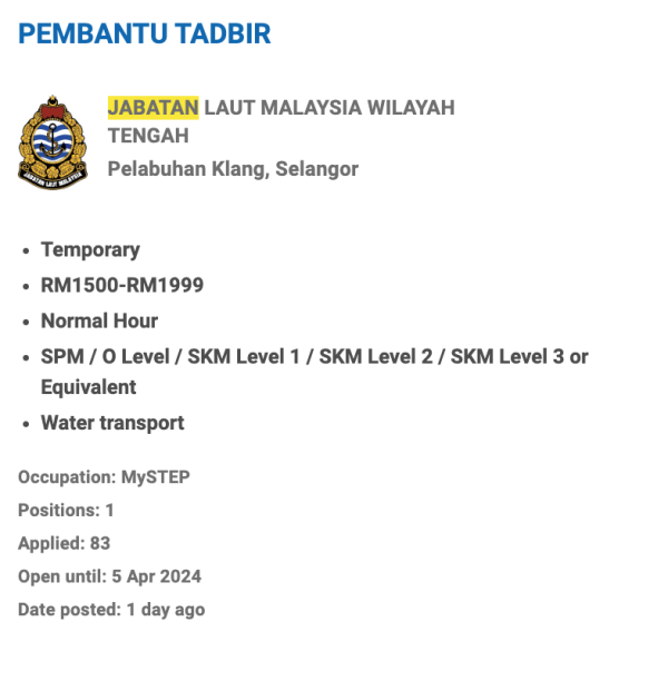 Permohonan jawatan ini boleh dibuat melalui Portal MyFutureJobs. Sila ke Portal MyFutureJobs dan Masukkan Kata Carian yang ingin dicari “JABATAN LAUT MALAYSIA WILAYAH TENGAH” di bahagian carian untuk memohon jawatan yang diiklankan.