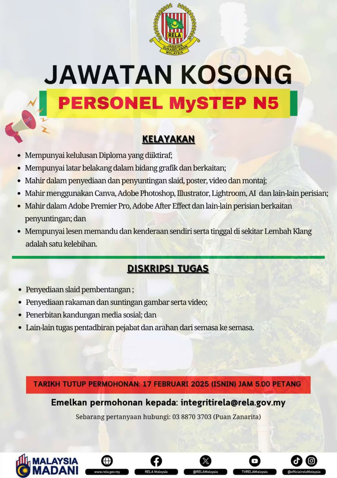 Iklan Terkini Jabatan Sukarelawan Malaysia (RELA) Klik Jawatan Disini Like serta Ikut Facebook Kami, follow Chanel WhatsApp Jawatan Kosong & Telegram Portal SPA9 untuk capaian pantas kekosongan jawatan daripada kami sekarang.