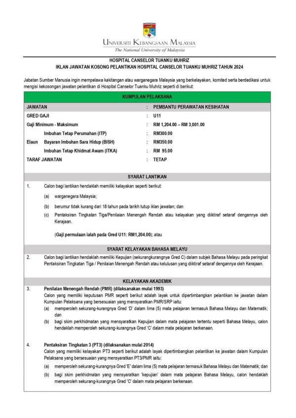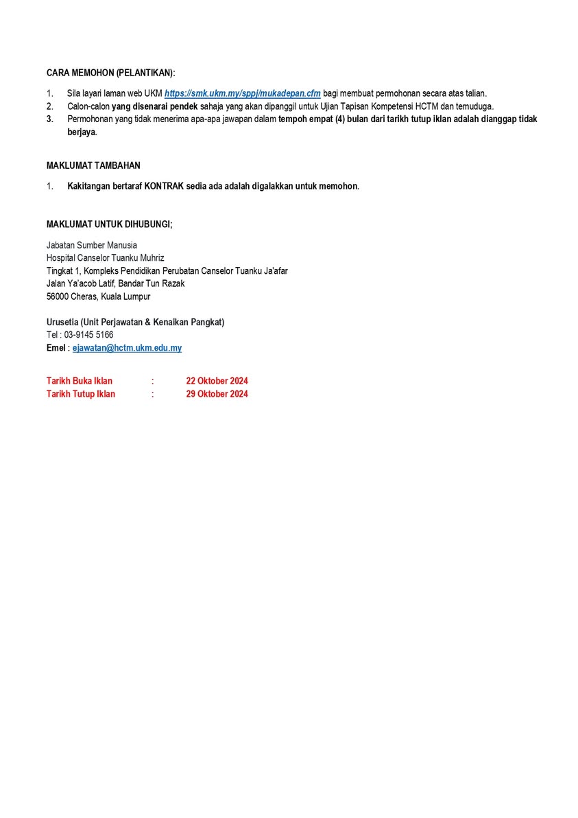 Iklan Terkini Jawatan Kosong Hospital Canselor Tuanku Muhriz (HCTM) UKM Like serta Ikut Facebook Kami, follow Chanel WhatsApp Jawatan Kosong & Telegram Portal SPA9 untuk capaian pantas kekosongan jawatan daripada kami sekarang. Klik Jawatan Disini