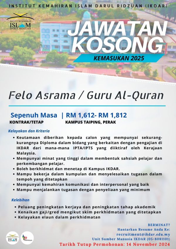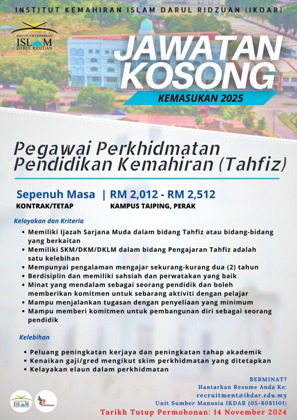 Iklan Terkini Jawatan Kosong Institut Kemahiran Islam Darul Ridzuan Like serta Ikut Facebook Kami, follow Chanel WhatsApp Jawatan Kosong & Telegram Portal SPA9 untuk capaian pantas kekosongan jawatan daripada kami sekarang.