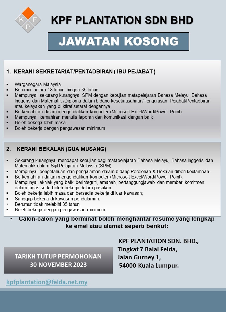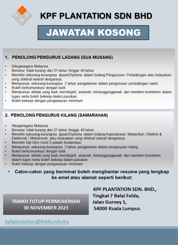 Iklan Terkini Jawatan Kosong KPF Plantation Sdn Bhd Like serta Ikut Facebook Kami, follow Chanel WhatsApp Jawatan Kosong & Telegram Portal SPA9 untuk capaian pantas kekosongan jawatan daripada kami sekarang.