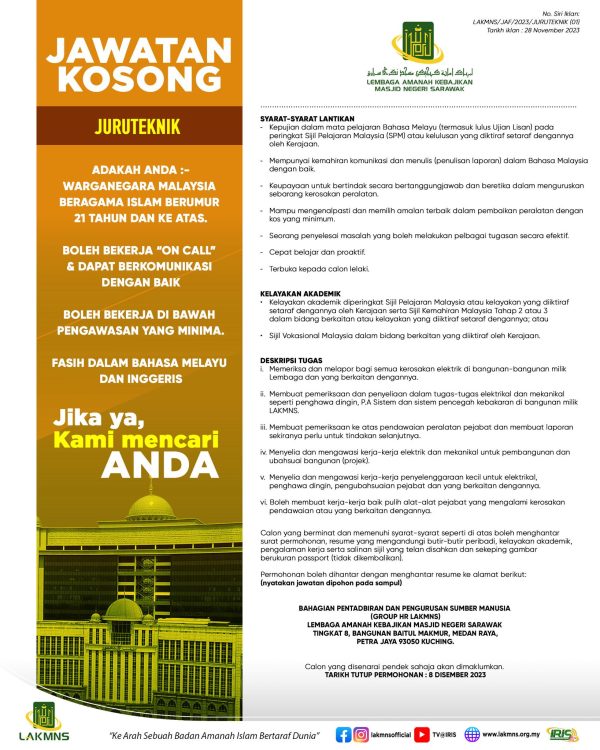 Iklan Terkini Jawatan Kosong Lembaga Amanah Kebajikan Masjid Negeri Sarawak Like serta Ikut Facebook Kami, follow Chanel WhatsApp Jawatan Kosong & Telegram Portal SPA9 untuk capaian pantas kekosongan jawatan daripada kami sekarang.