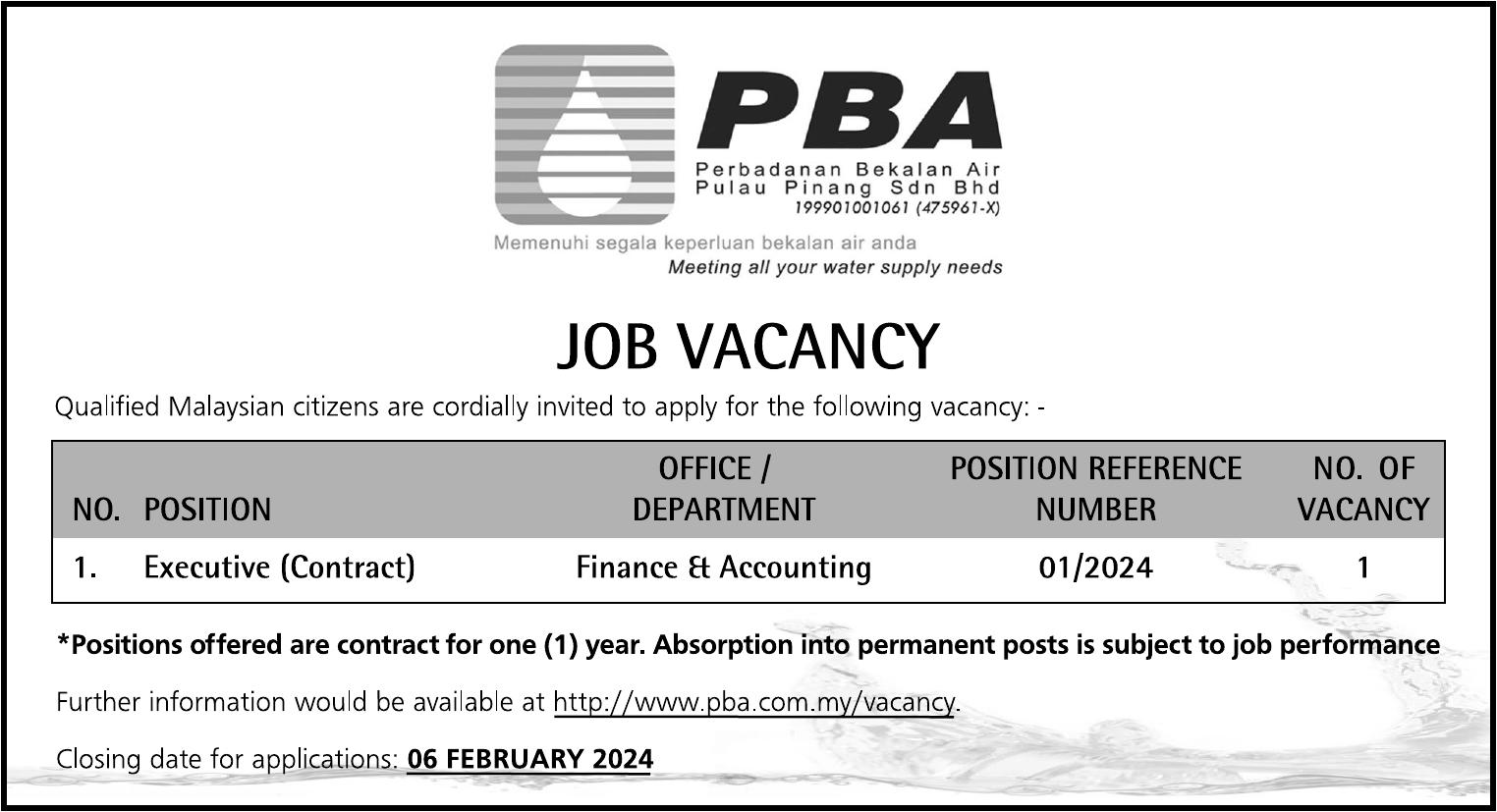 Iklan Terkini Jawatan Kosong Perbadanan Bekalan Air Pulau Pinang Sdn Bhd PBA_23Jan_NST Like serta Ikut Facebook Kami, follow Chanel WhatsApp Jawatan Kosong & Telegram Portal SPA9 untuk capaian pantas kekosongan jawatan daripada kami sekarang.