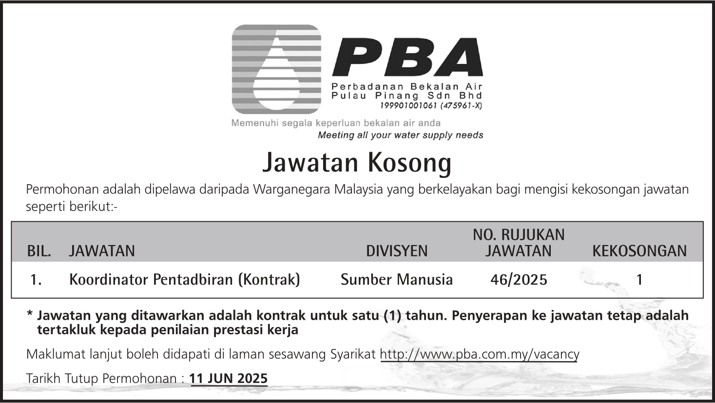 Iklan Terkini Jawatan Kosong Perbadanan Bekalan Air Pulau Pinang Sdn Bhd Like serta Ikut Facebook Kami, follow Chanel WhatsApp Jawatan Kosong & Telegram Portal SPA9 untuk capaian pantas kekosongan jawatan daripada kami sekarang.