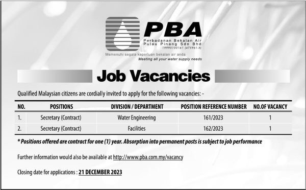 Iklan Terkini Jawatan Kosong Perbadanan Bekalan Air Pulau Pinang Sdn Bhd PBA_NST_8x4_071223 Like serta Ikut Facebook Kami, follow Chanel WhatsApp Jawatan Kosong & Telegram Portal SPA9 untuk capaian pantas kekosongan jawatan daripada kami sekarang.