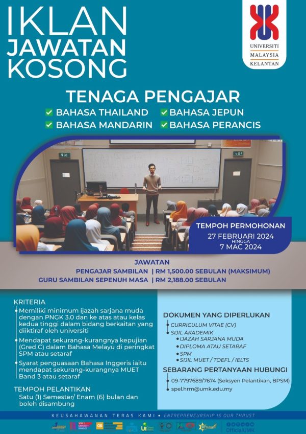 Iklan Terkini Jawatan Kosong Universiti Malaysia Kelantan (UMK) Like serta Ikut Facebook Kami, follow Chanel WhatsApp Jawatan Kosong & Telegram Portal SPA9 untuk capaian pantas kekosongan jawatan daripada kami sekarang.