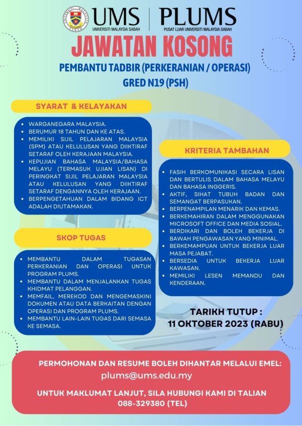 Iklan Terkini Jawatan Kosong Universiti Malaysia Sabah (UMS) Like serta Ikut Facebook Kami, follow Chanel WhatsApp Jawatan Kosong & Telegram Portal SPA9 untuk capaian pantas kekosongan jawatan daripada kami sekarang.