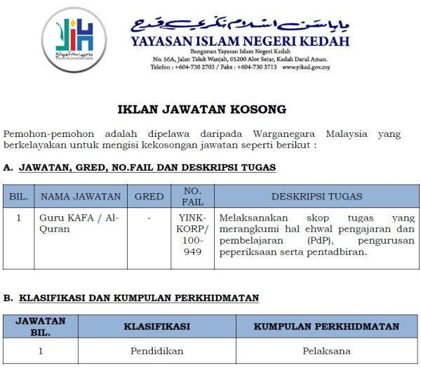 Iklan Terkini Jawatan Kosong Yayasan Islam Negeri Kedah Like serta Ikut Facebook Kami, follow Chanel WhatsApp Jawatan Kosong & Telegram Portal SPA9 untuk capaian pantas kekosongan jawatan daripada kami sekarang. Klik Jawatan Disini