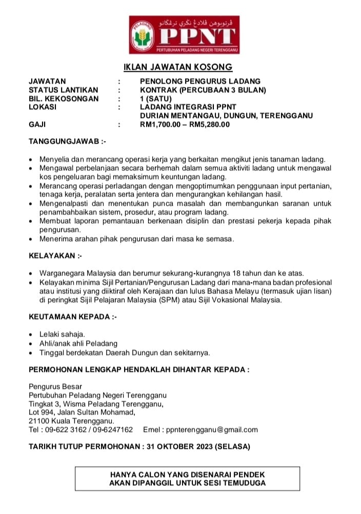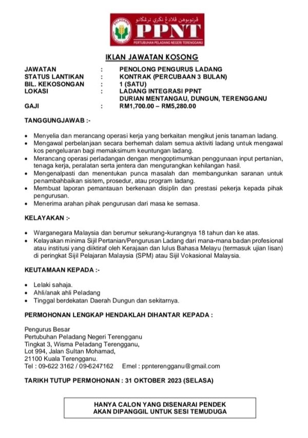 Iklan Terkini Jawatan Pertubuhan Peladang Negeri Terengganu Like serta Ikut Facebook Kami, follow Chanel WhatsApp Jawatan Kosong & Telegram Portal SPA9 untuk capaian pantas kekosongan jawatan daripada kami sekarang.