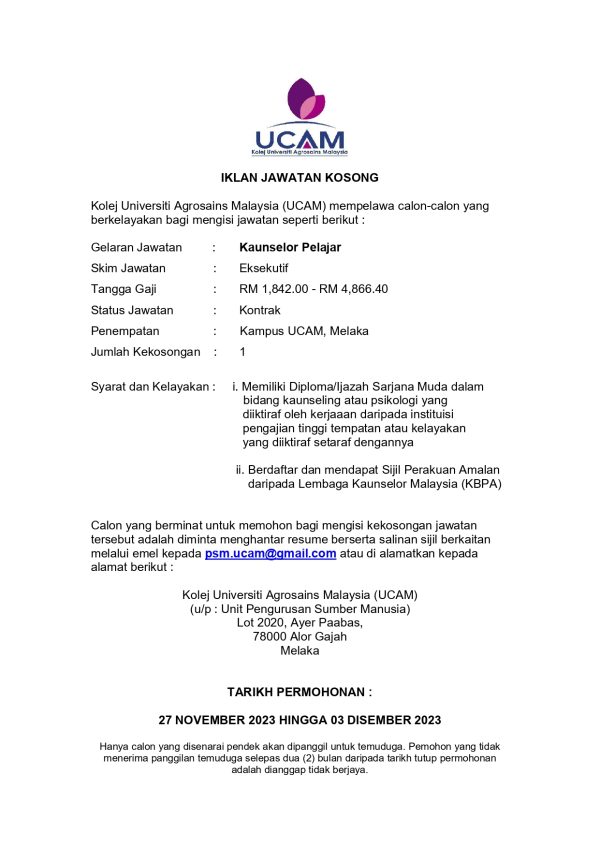 Iklan Terkini Kolej Universiti Agrosains Malaysia Like serta Ikut Facebook Kami, follow Chanel WhatsApp Jawatan Kosong & Telegram Portal SPA9 untuk capaian pantas kekosongan jawatan daripada kami sekarang. Klik Jawatan Disini