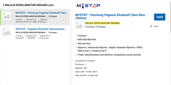 Permohonan jawatan ini boleh dibuat melalui Portal MyFutureJobs. Sila ke Portal MyFutureJobs dan Masukkan Kata Carian yang ingin dicari “MAJLIS KESELAMATAN NEGARA” di bahagian carian untuk memohon jawatan yang diiklankan.