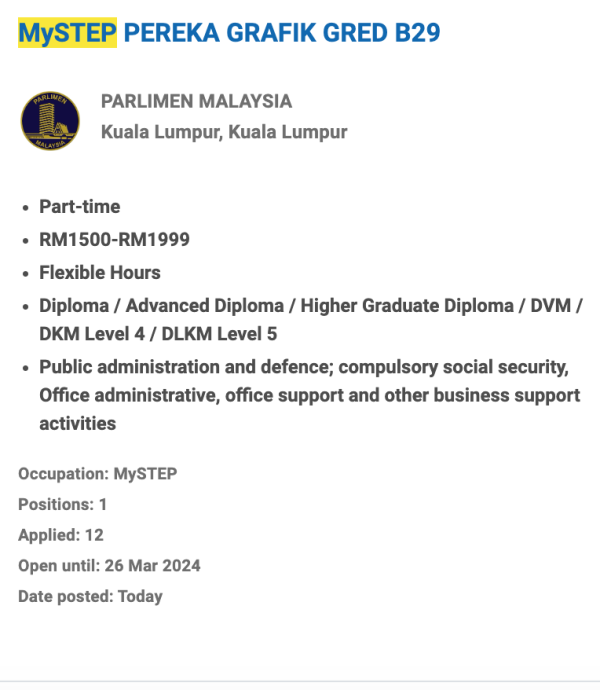 Permohonan jawatan ini boleh dibuat melalui Portal MyFutureJobs. Sila ke Portal MyFutureJobs dan Masukkan Kata Carian yang ingin dicari “PARLIMEN MALAYSIA” di bahagian carian untuk memohon jawatan yang diiklankan.