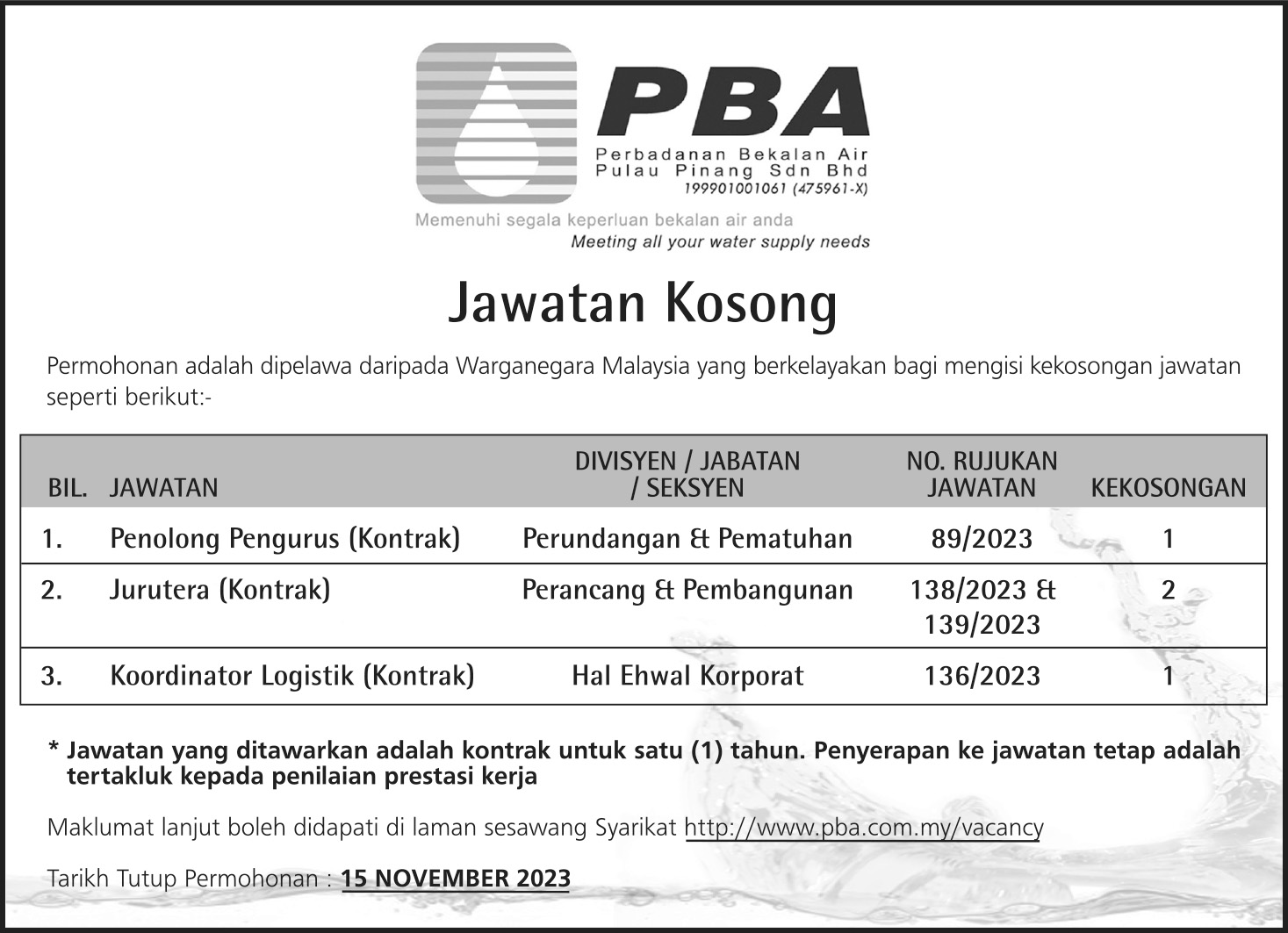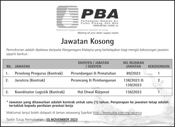 Iklan Terkini Perbadanan Bekalan Air Pulau Pinang Sdn Bhd Like serta Ikut Facebook Kami, follow Chanel WhatsApp Jawatan Kosong & Telegram Portal SPA9 untuk capaian pantas kekosongan jawatan daripada kami sekarang.