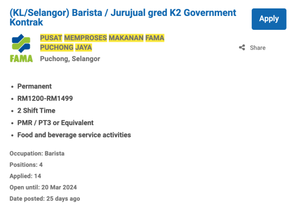 Permohonan jawatan ini boleh dibuat melalui Portal MyFutureJobs. Sila ke Portal MyFutureJobs dan Masukkan Kata Carian yang ingin dicari “PUSAT MEMPROSES MAKANAN FAMA PUCHONG JAYA” di bahagian carian untuk memohon jawatan yang diiklankan.
