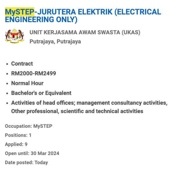 Permohonan jawatan ini boleh dibuat melalui Portal MyFutureJobs. Sila ke Portal MyFutureJobs dan Masukkan Kata Carian yang ingin dicari “UNIT KERJASAMA AWAM SWASTA (UKAS)” di bahagian carian untuk memohon jawatan yang diiklankan.